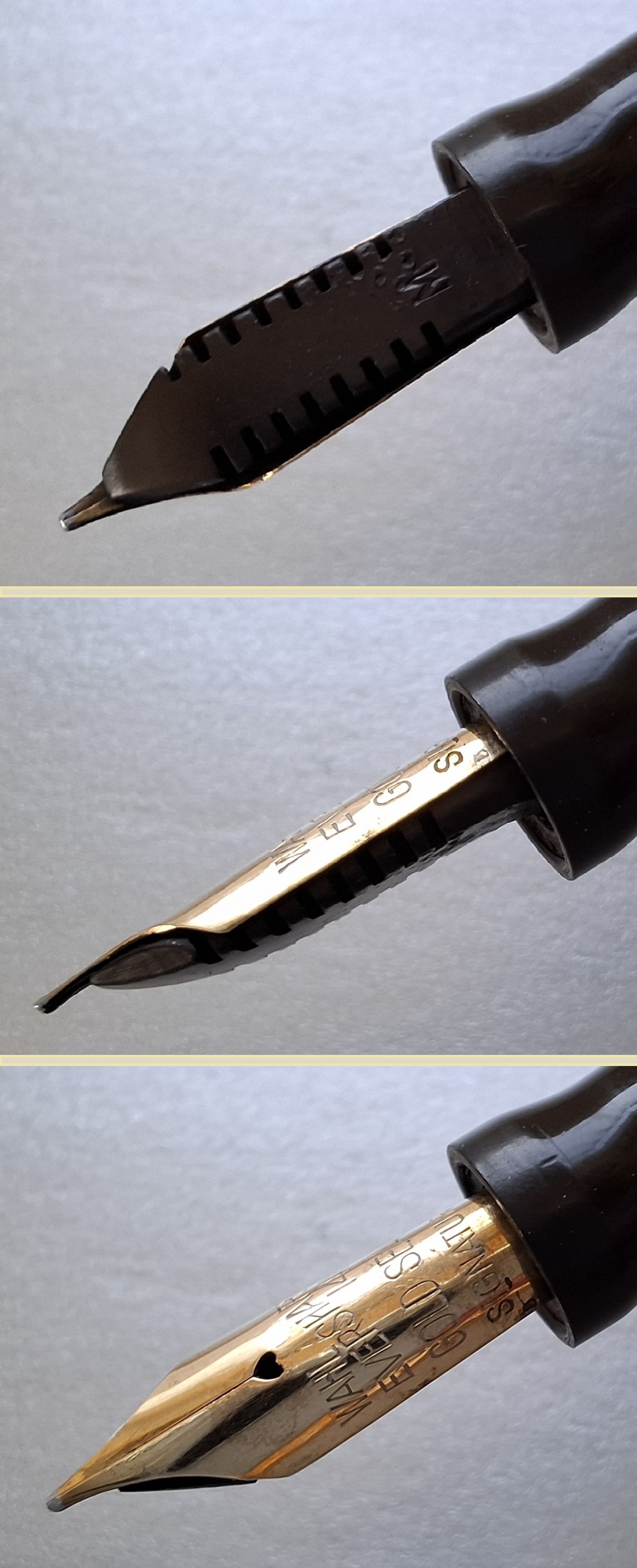Foto di una penna Eversharp. Modello: Equi-Poised. Caricamento a levetta. Realizzazione in celluloide "Black and Pearl". Dettaglio del pennino. Dettaglio dell'alimentatore. Prima versione, ritirata quasi subito dal commercio. Contributo di Giorgio (utente forum Musicus).