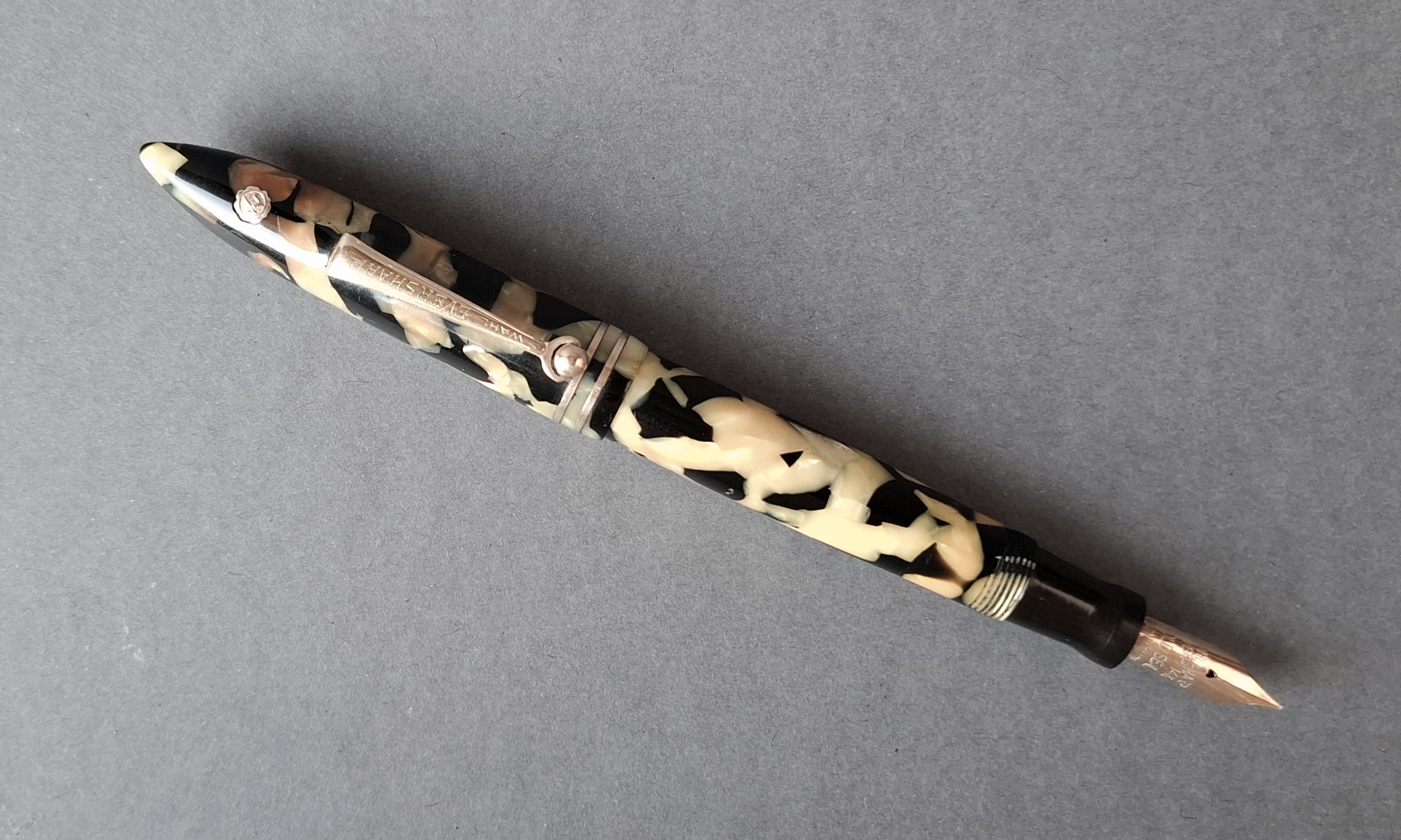 Photo of a pen produced by Eversharp. Model: Equi-Poised. Filling system: lever filler. In "Black and Pearl" celluloid. First version, retired almost immediately.