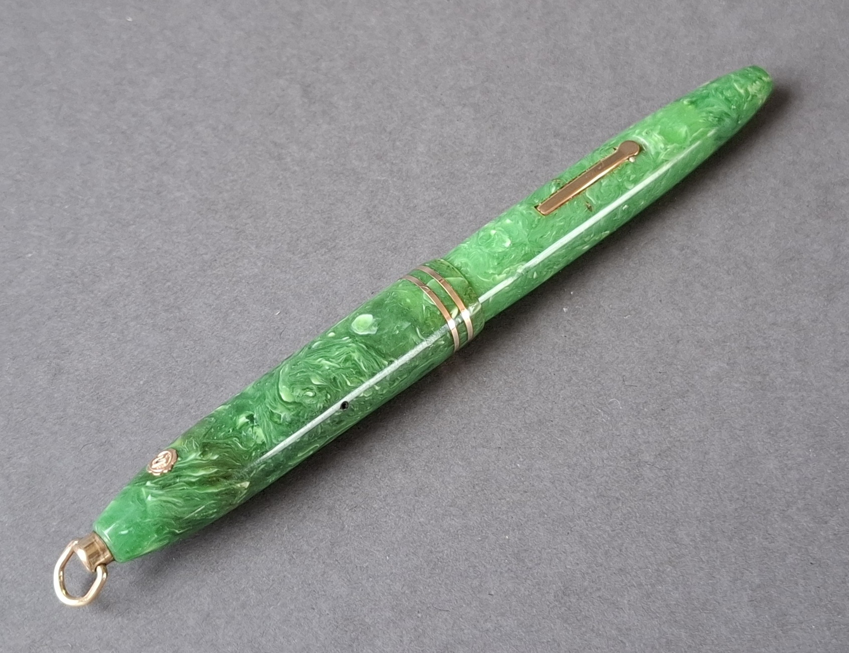 Foto di una penna Eversharp. Modello: Equi-Poised. Caricamento a levetta. Realizzazione in celluloide "Jade Green". Seconda versione di transizione. Contributo di Giorgio (utente forum Musicus).