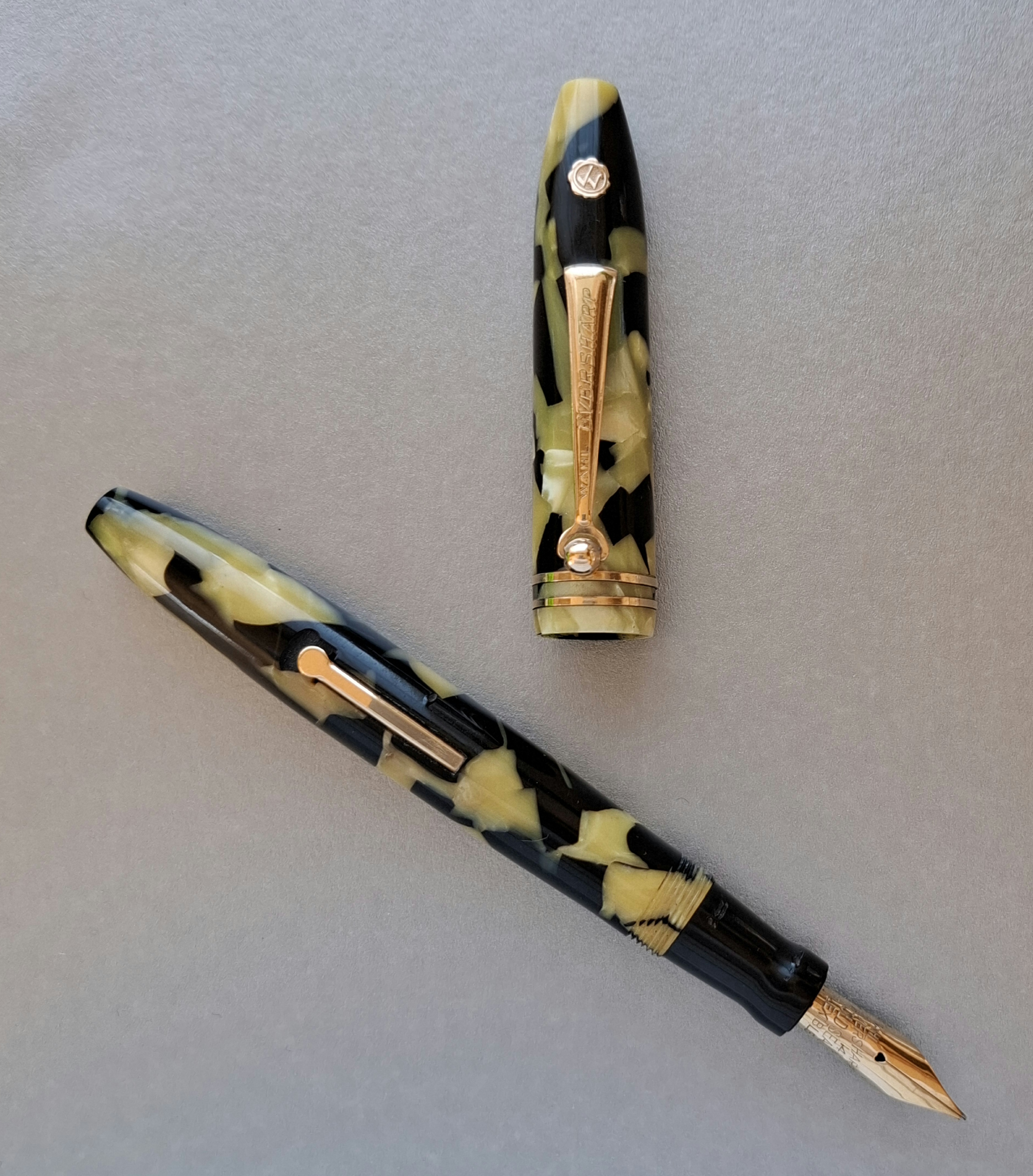 Photo of a pen produced by Eversharp. Model: Equi-Poised. Filling system: lever filler. In "Black and Pearl" celluloid. Second version, created by shortening the first one.