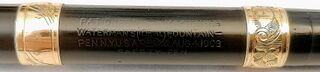 Photo of a pen produced by Waterman. Model: Waterman 45. Filling system: safety. In black chased hard rubber. Detail of inscription. Version with two golden bands and accommodation clip.