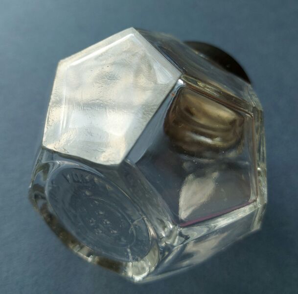 Photo of an ink bottle produced by Waterman. A De Luxe Tip-Fill ink bottle.