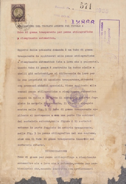 Privativa industriale per un modello di fabbrica della Stiassi e Tantini. Testo descrittivo della registrazione: "Tubo di gomma trasparente per penne stilografiche a riempimento automatico".