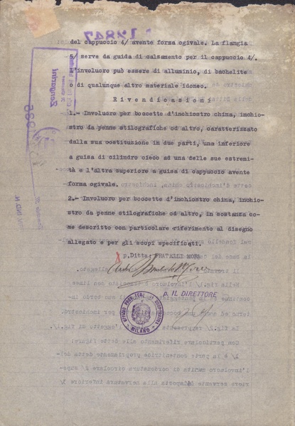 Privativa industriale per un modello di fabbrica. Testo descrittivo della registrazione: "Involucro metallico o d'altro materiale con coperchio ogivale per boccetto d'inchiostro china, inchiostro da penne stilografiche e simili".