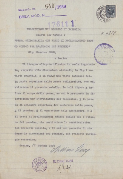 Privativa industriale per un modello di fabbrica della Zemax. Testo descrittivo della registrazione: "Penna stilografica con pezzo di prolungamento tronco conico per l'attacco del pennino".