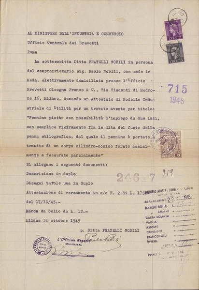 Privativa industriale per un modello di utilità. Testo descrittivo della registrazione: "Pennino piatto con possibilità d'impiego da due lati, con semplice rigiramento fra le dita del fusto della penna stilografica, dal quale il pennino é portato a tramite di un corpo cilindro-conico forato assialmente e fessurato parzialmente".