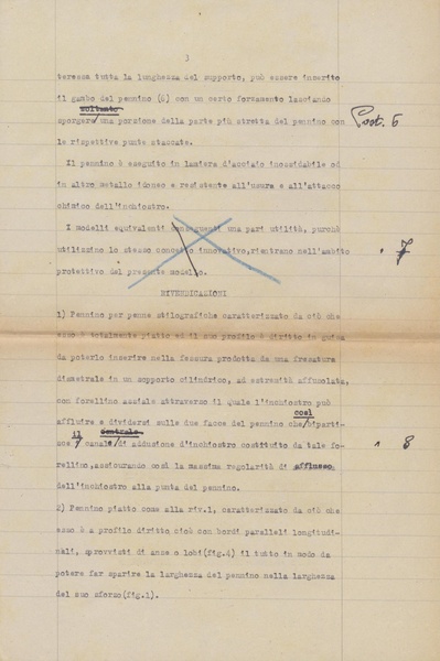 Privativa industriale per un modello di utilità. Testo descrittivo della registrazione: "Pennino piatto con possibilità d'impiego da due lati, con semplice rigiramento fra le dita del fusto della penna stilografica, dal quale il pennino é portato a tramite di un corpo cilindro-conico forato assialmente e fessurato parzialmente".