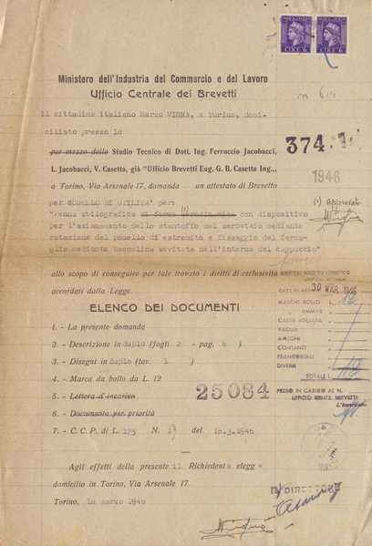 Privativa industriale per un modello di utilità. Testo descrittivo della registrazione: "Penna stilografica con dispositivo per l'azionamento dello stantuffo del serbatoio mediante rotazione del pomello di estremità e fissaggio del fermaglio mediante boccolina avvitata nell'interno del cappuccio".