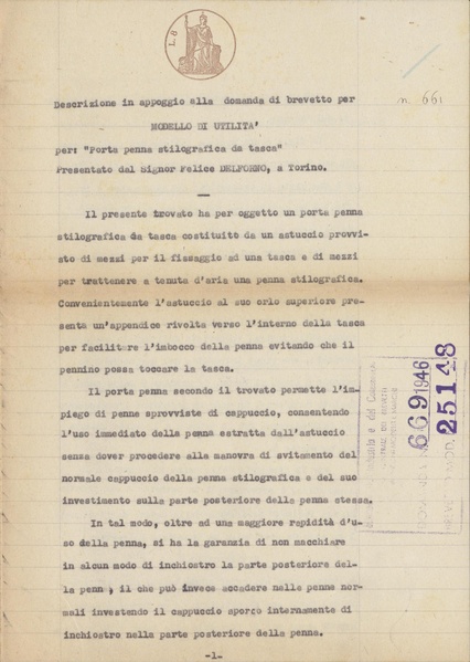 Privativa industriale per un modello di utilità. Testo descrittivo della registrazione: "Porta penna stilografica da tasca".