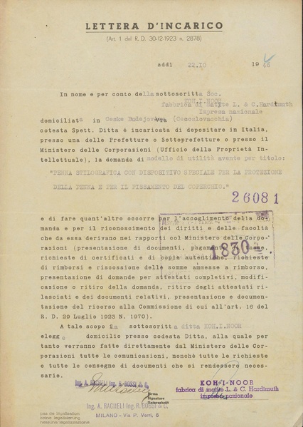 Privativa industriale per un modello di utilità della Hardtmuth. Testo descrittivo della registrazione: "Penna stilografica con dispositivo speciale per la protezione della penna e per il fissamento del coperchio".