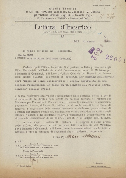 Privativa industriale per un modello ornamentale. Testo descrittivo della registrazione: "Becco di penna stilografica a sfera, costituito da una capsula riproducente la forma di un pennino sul relativo portapennino".