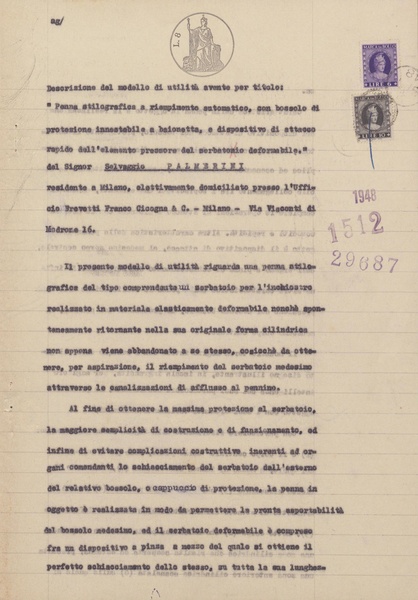 Privativa industriale per un modello di utilità della Titanus. Testo descrittivo della registrazione: "Penna stilografica a riempimento automatico, con bossolo di protezione innestabile a baionetta, e dispositivo di attacco rapido dell'elemento pressore del serbatoio deformabile".