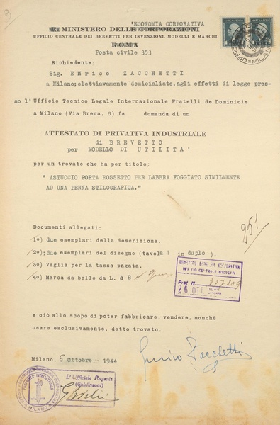 Privativa industriale per un modello di utilità. Testo descrittivo della registrazione: "Astuccio porta rossetto per labbra foggiato similmente ad una penna stilografica".
