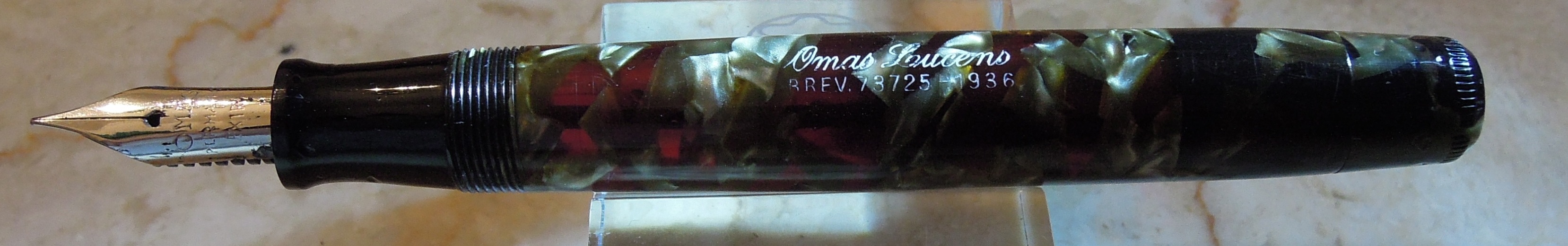 Foto di una penna Omas. Modello: Lucens. Caricamento a stantuffo tuffante. Realizzazione in celluloide grigio marmorizzato. Misura grande. Versione con tre anellini, finiture cromate, pennino in "Permanio". Riporta stampigliato il brevetto nº IT-73725-1936. Contributo di Roberto Vetrugno (utente forum.fountainpen.it roberto v).