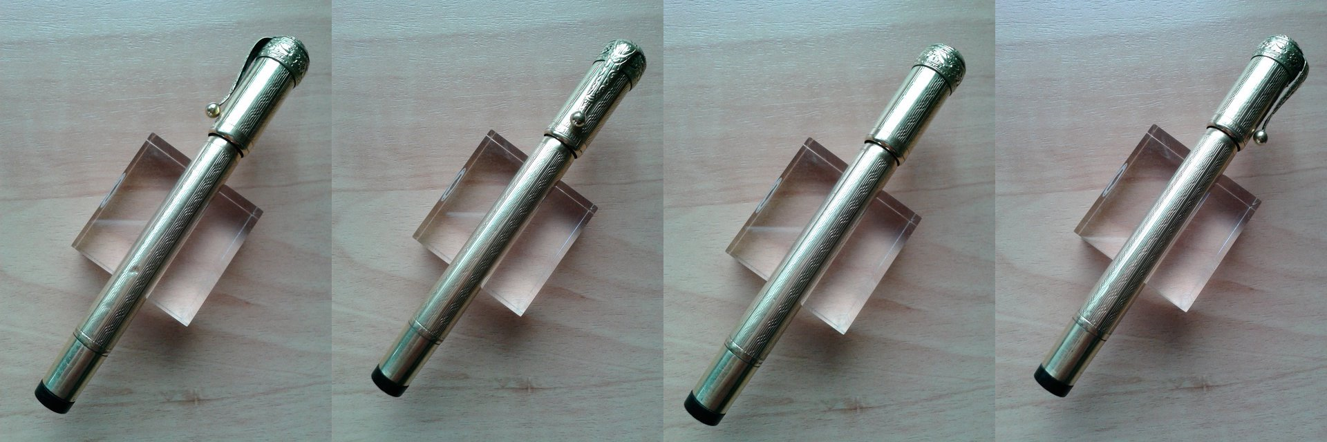 Photo of a pen produced by Standard. Filling system: button filler. With geometric pattern gold rolled overlay. Unidentified model.