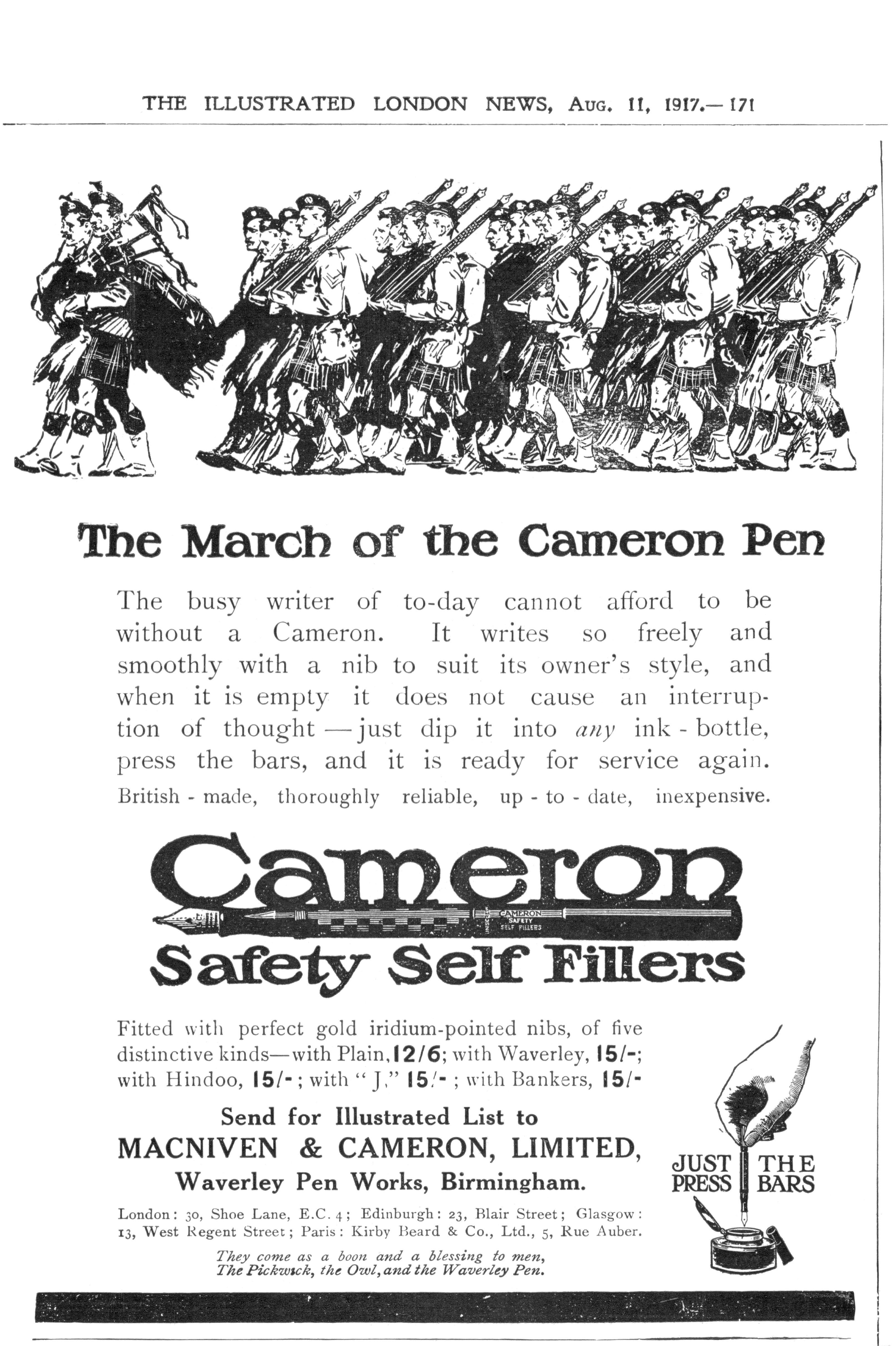 Scansione di una pubblicità Cameron datata 1917-08-11. Pubblicazione su: The Illustrated London News. Indica come indirizzo: "Waverley Pen Works, Birmingham". Ritoccata dall'autore per una migliore nitidezza. Data visibile direttamente. Pubblicizza il modello Cameron Safety Self Filler.