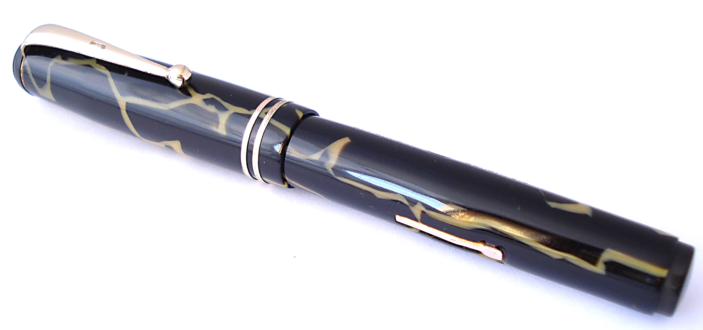 Foto di una penna Aurora. Modello: Aurora ML. Realizzazione in celluloide nera venata crema. Serie ML, ("Militare a Leva"). Contributo di Fabio (utente forum fountainpen.it fabbale09).