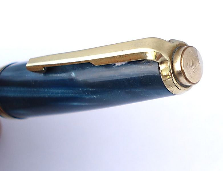 Photo of a pen produced by Corona di Mario Diaz. Filling system: button filler. In striated blue celluloid. Detail of cap.