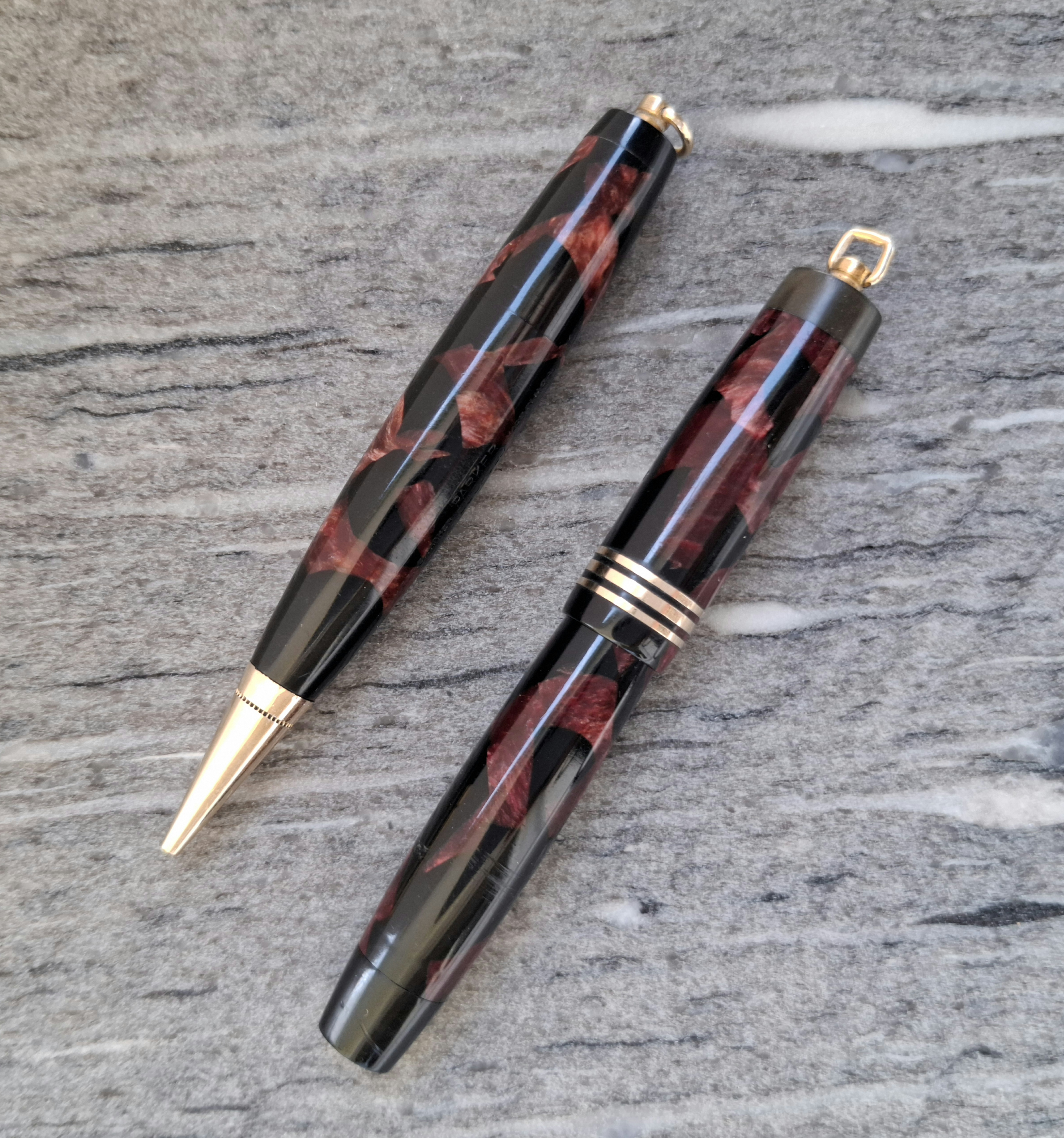 Photo of a pen/pencil set produced by Parker. Model: Duofold. Filling system: button filler. In Burgundy and Black marbled celluloid. Vest pocket version.