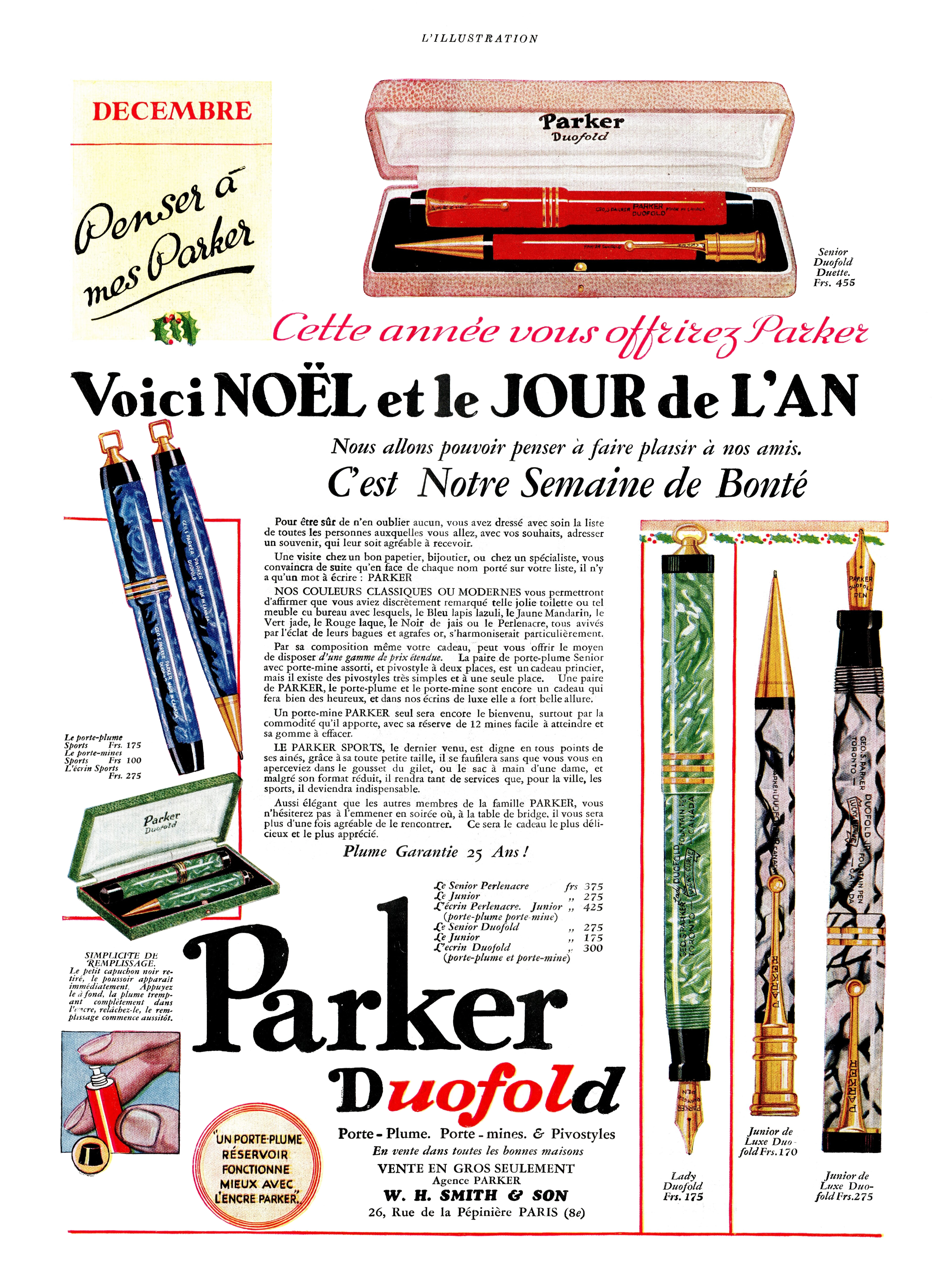 Scansione di una pubblicità Parker datata 1930-12. Pubblicazione su: L'Illustration. Ritoccata dall'autore per una migliore nitidezza. Contributo di Giorgio (utente forum Musicus). Data indicata dal fornitore. Pubblicizza le diverse versioni del modello Duofold in diversi colori di celluloide nelle varie misure. Cita l'introduzione delle versioni Vest pocket (chiamate "Sports").