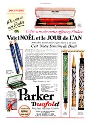 Scanning of advertising from Parker dated 1930-12. Published on: L'Illustration. Retouched by the author for a better sharpness. Dating given by the provider. Advertising for the different versions of Duofold model in different celluloid colors and different sizes. Mention the Vest pocket versions (called "Sports") introduction.
