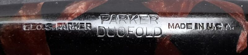 Photo of a pencil produced by Parker. Model: Duofold. Filling system: button filler. In Burgundy and Black marbled celluloid. Detail of inscription. Vest pocket version.