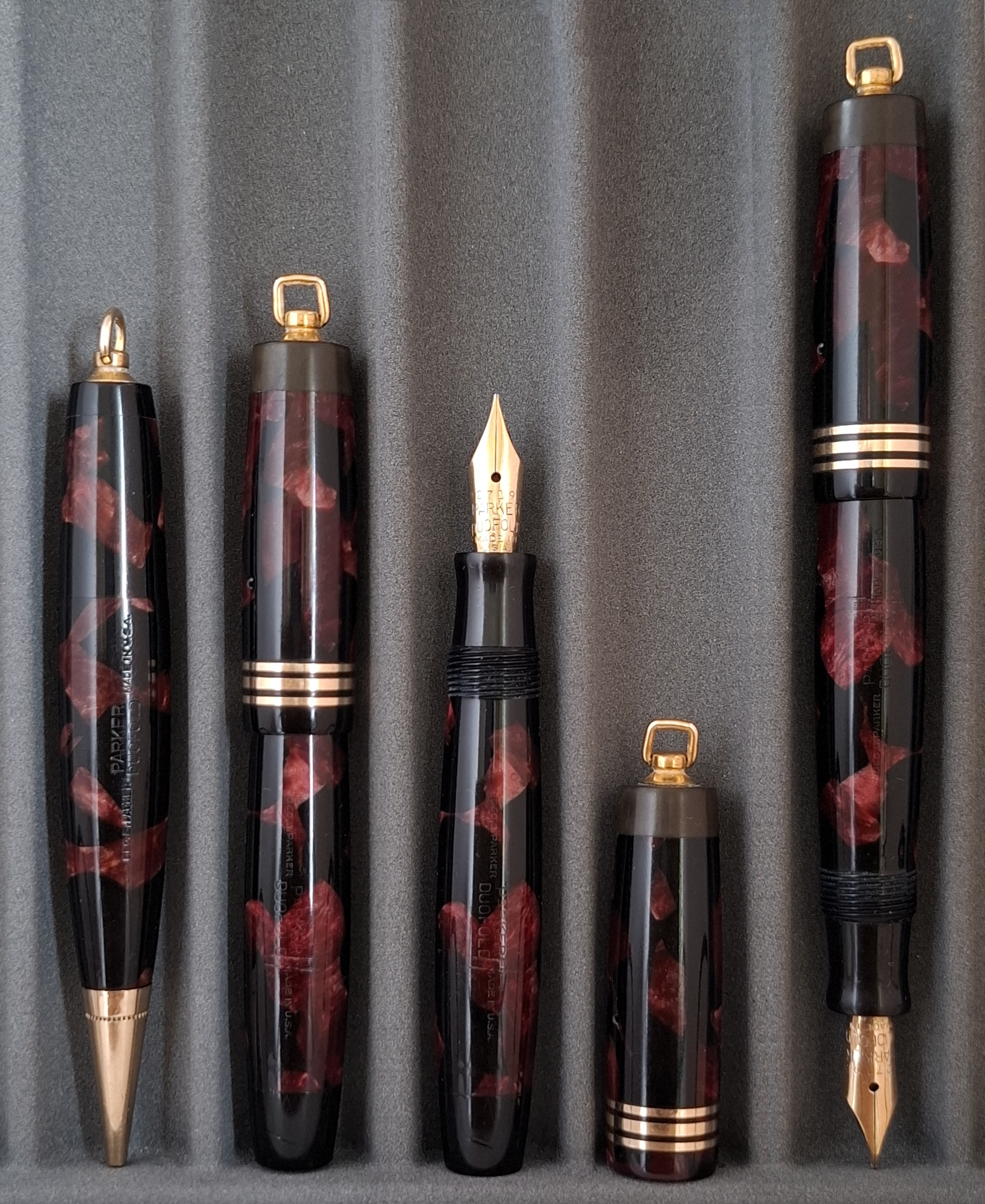 Photo of a pen/pencil set produced by Parker. Model: Duofold. Filling system: button filler. In Burgundy and Black marbled celluloid. Vest pocket version.