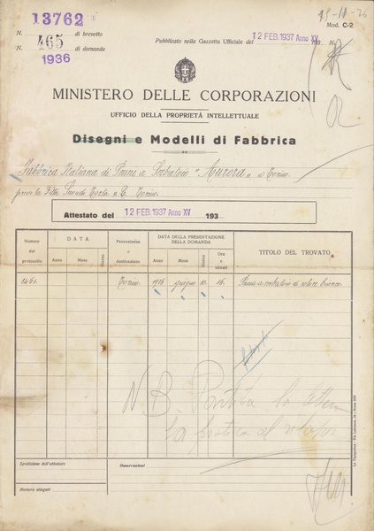 Privativa industriale per un modello di fabbrica della Aurora. Testo descrittivo della registrazione: "Penna a serbatoio di colore bianco".