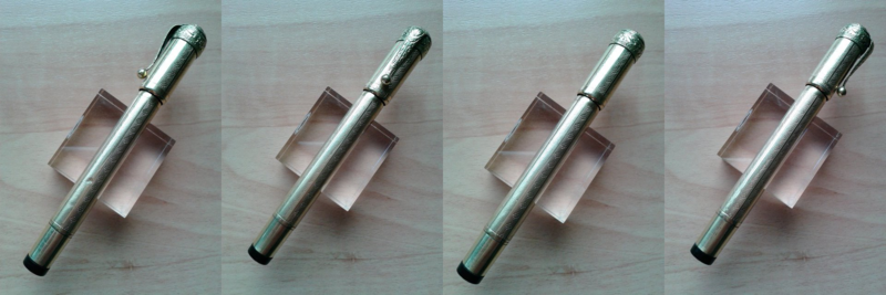 Photo of a pen produced by Standard. Filling system: button filler. With geometric pattern gold rolled overlay. Detail of cap. Unidentified model.