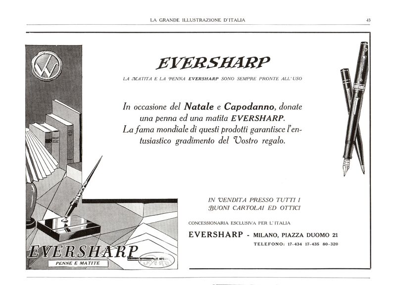Scanning of advertising from Eversharp dated 1930-12. Published on: La Grande Illustrazione d'Italia, year VII, n. 12, pag. 43. Dating established by the publication date of the volume from which the page is taken. Advertising for a Deco Band.
