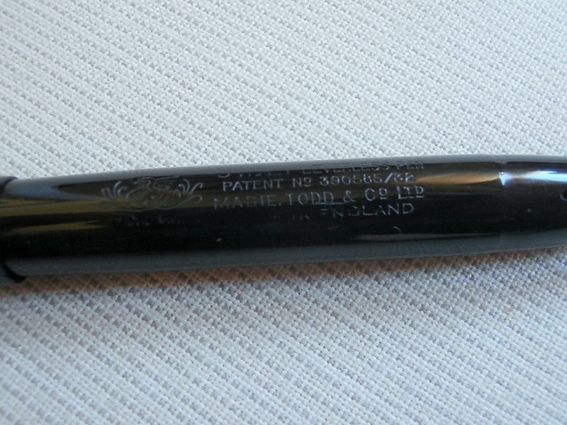 Photo of a pen produced by Swan. Model: Swan L 212. Filling system: "Leverless". In black celluloid. Detail of inscription. Model marked L212/60. With the patent nº GB-390585 imprint in the barrel.