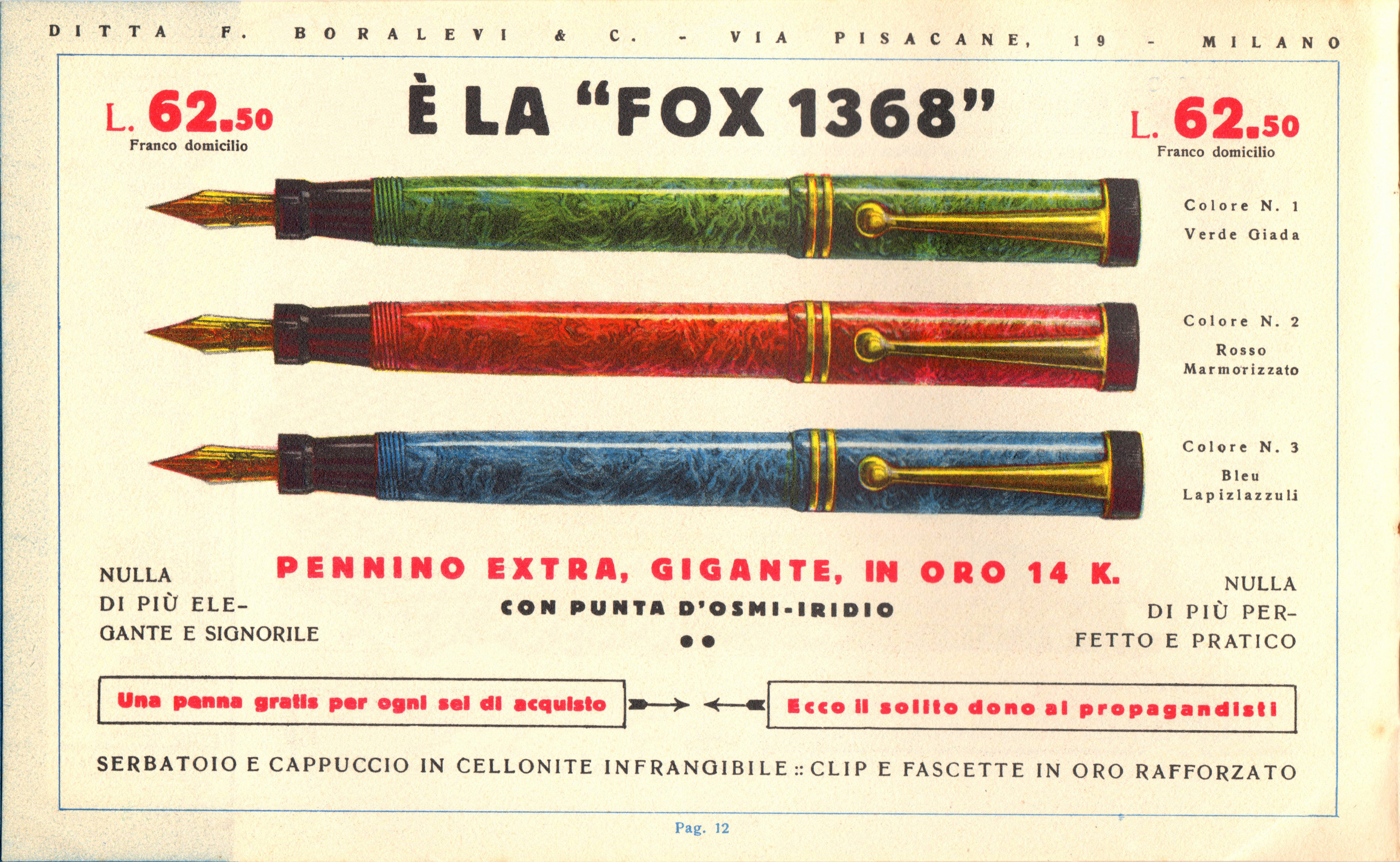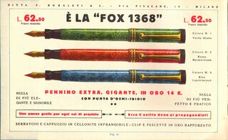 Scansione di una pagina di catalogo Boralevi datata 1931-10. Ritoccata dall'autore per una migliore nitidezza. Contributo di una persona che ha chiesto di restare anonima. Data riportata su un'altra pagina. Catalogo 1932, anno X°, N. 22, ottobre 1931 - aprile 1932. Dodicesima pagina. Mostra il modello Fox 1368.