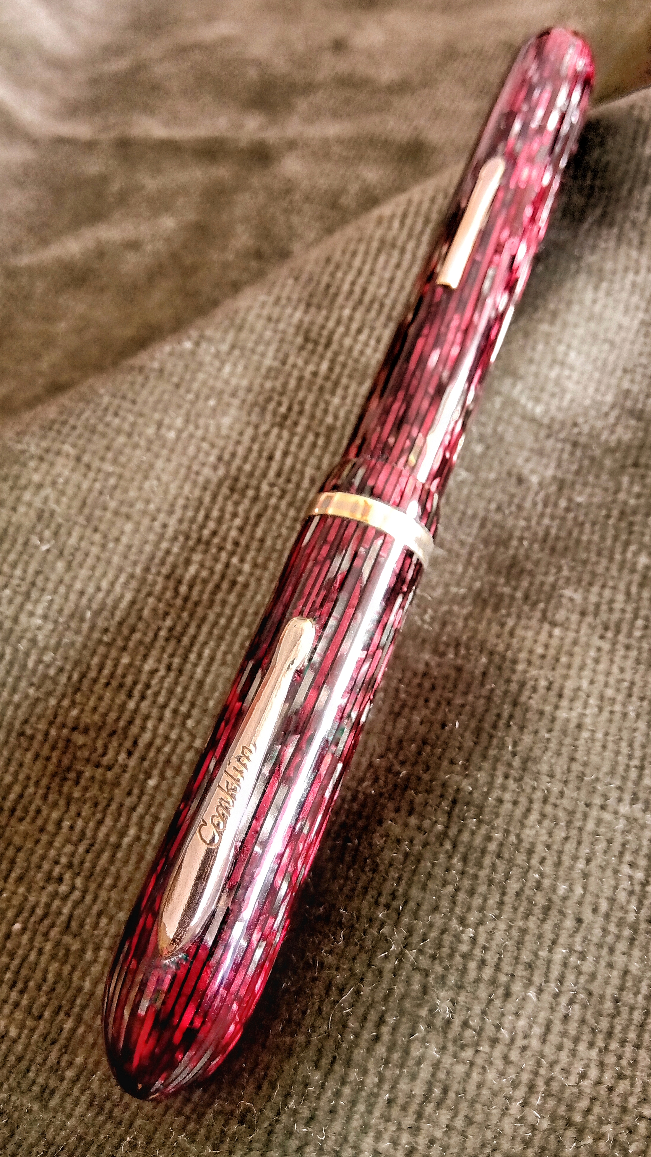 Foto di una penna Conklin. Modello: Glider. Caricamento a levetta. Realizzazione in celluloide a strisce rosse con toni grigi. Modello della tarda produzione di Chicago. Contributo di Gustavo, (utente forum gfrico2000).