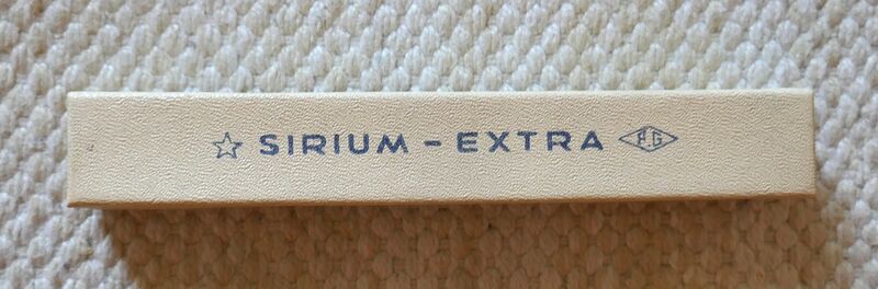 Foto di una penna Sirium Extra (un marchio della Giacomazzi). Caricamento a stantuffo. Realizzazione in celluloide nera. Dettaglio della confezione. Modello con clip a freccia. Contributo di Andrea (utente forum bisguillo).