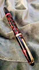 Photo of a stilographic pen produced by Rotring. Model: Tintenkuli. Filling system: piston filler. In marbled red celluloid. Ogival version with tapered clip.