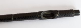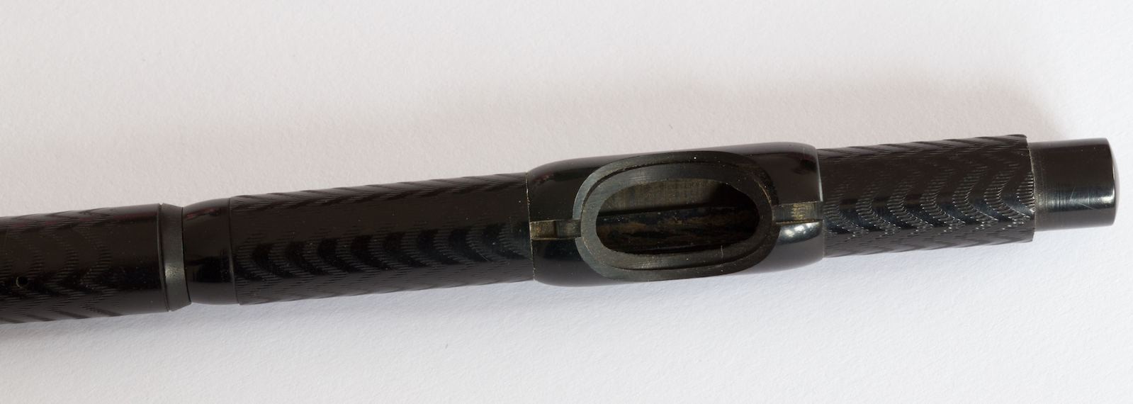 Foto di una penna Perfection. Caricamento "sleeve filler". Realizzazione in ebanite nera cesellata con motivo a onde. Dettaglio del caricamento. Modello ignoto. Contributo di Luca (utente forum LucaC).