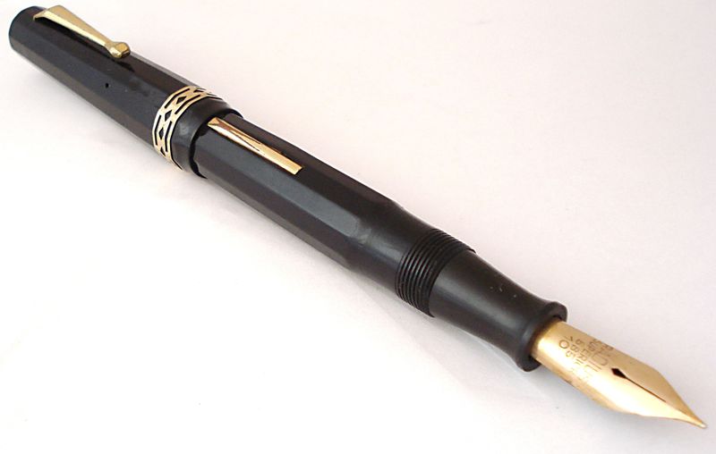 Foto di una penna Radius (sottomarca Società Anonima Fabbrica Italiana Stilografiche). Modello: Radius Superior. Caricamento a levetta. Realizzazione in celluloide nera. Versione sfaccettata. Contributo di Fabio (utente forum fountainpen.it fabbale09).