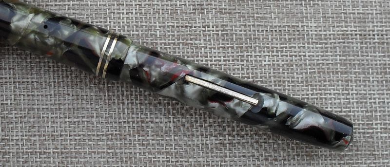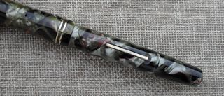 Foto di una penna Summit (un marchio della Lang - Curzon - Summit). Modello: Summit Sentinel. Caricamento a levetta. Realizzazione in celluloide marmorizzata verde. Usa gli stessi fusto e cappuccio della S.175. Presenta il marchio Unbreakable riferito alla celluloide. Contributo di Alberto (utente forum A Casirati).