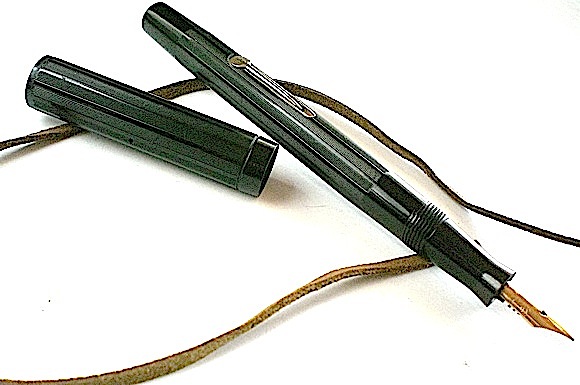 Foto di una penna Mallat. Modello: Mallat A52. Caricamento a levetta. Realizzazione in bachelite nera. Un modello flat top.