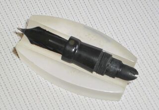 Photo of a pen produced by Parker. Model: Duofold. Detail of feeder. Photo of the nib group showing the Lucky Curve feeder.