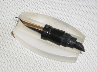 Photo of a pen produced by Parker. Model: Duofold. Photo of the nib group showing the Lucky Curve feeder.