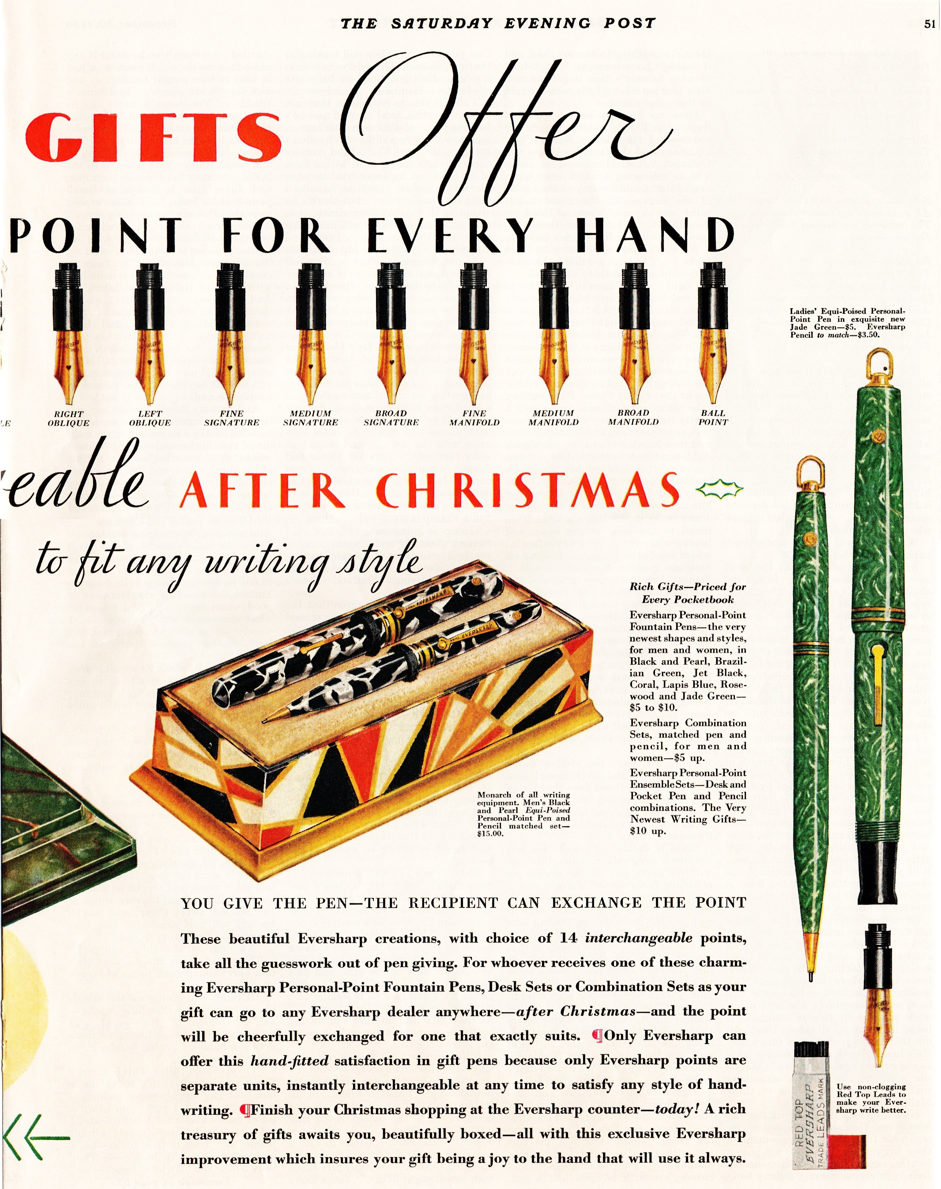 Scansione di una pubblicità Eversharp datata 1930-12-20. Pubblicazione su: The Saturday Evening Post. Ritoccata dall'autore per una migliore nitidezza. Contributo di Giorgio (utente forum Musicus). Data riportata su un'altra pagina. Pubblicizza le varie gradazioni dei pennini Personal Point ed i nuovi modelli Equi-Poised. Pagina destra.
