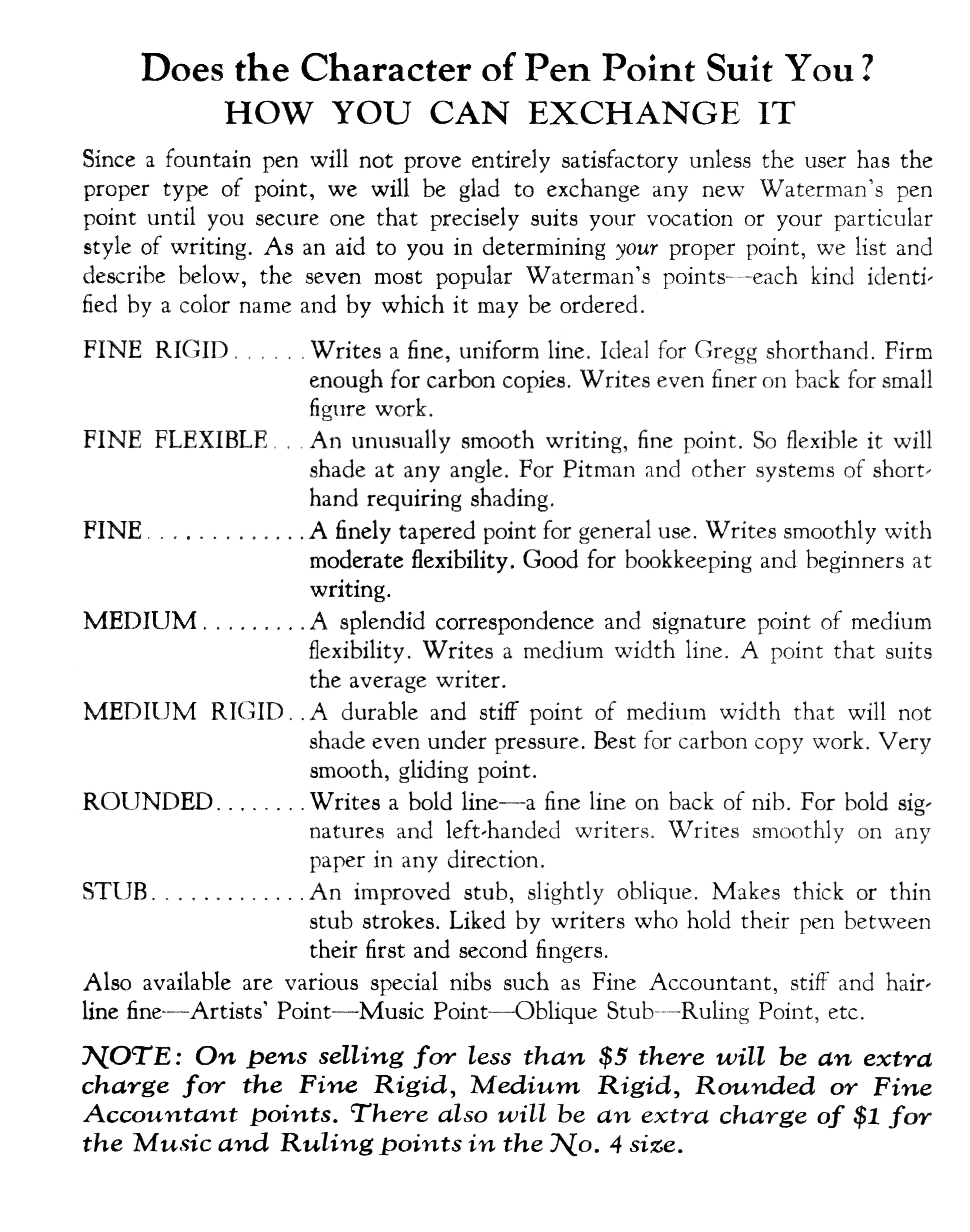Scansione di un foglietto di istruzioni Waterman del 1937. Data ricavata da quanto illustrato, vedi questo intervento sul forum. Pagina sinistra del lato interno. Illustra le varie tipologie di pennini disponibili. Ritoccata dall'autore per una migliore nitidezza. Contributo di Giorgio (utente forum Musicus). Da una confezione originale.