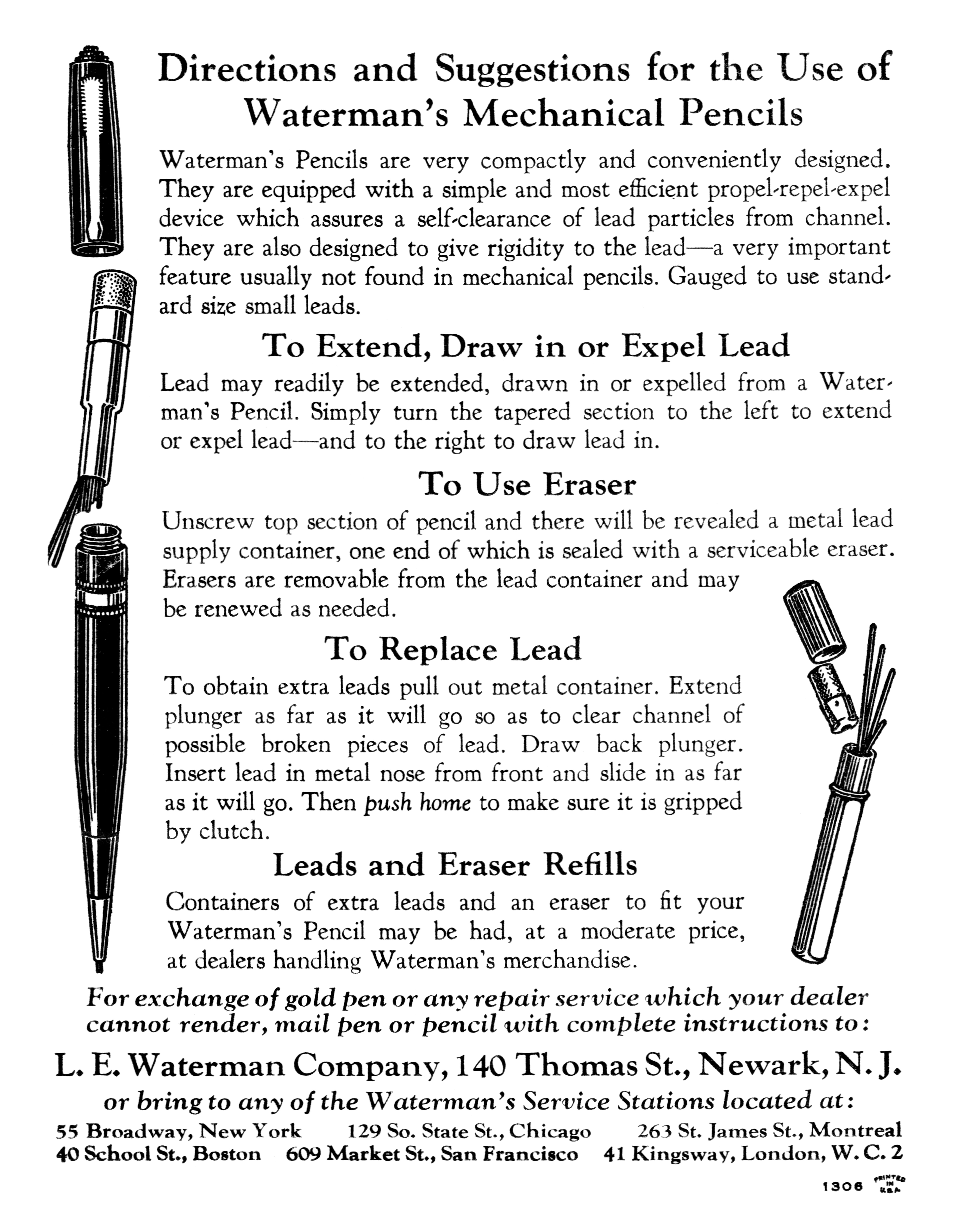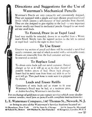 Scansione di un foglietto di istruzioni Waterman del 1937. Cita come indirizzo: "140, Thomas St., Newark, N.J.". Data ricavata da quanto illustrato, vedi questo intervento sul forum. Pagina mediana del lato esterno. Illustra le matite meccaniche Ink-Vue. Ritoccata dall'autore per una migliore nitidezza. Contributo di Giorgio (utente forum Musicus). Da una confezione originale.