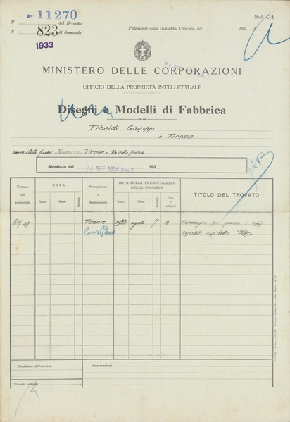 Privativa industriale per un modello di fabbrica della Tibaldi. Testo descrittivo della registrazione: "Fermaglio per penne e lapis tascabili così detto "Clips"".