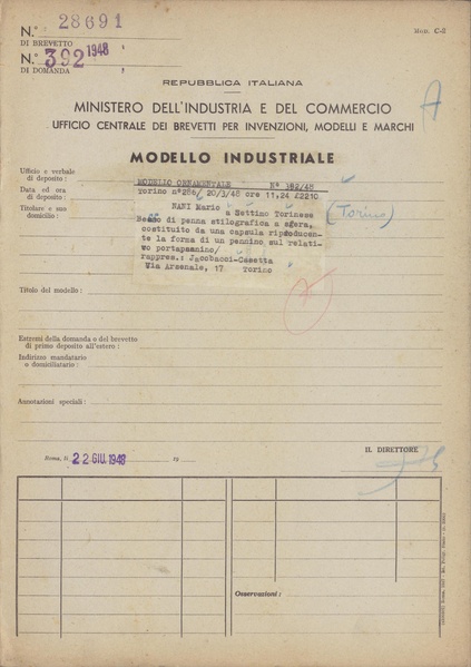 Versione del 1 set 2025 alle 22:44 di Piccardi (discussione | contributi) (== Dettagli == {{InfoModello |Numero=28691 |Data=1948-06-22 |Richiesto=1948-03-20 |Titolare=Mario Nani |Tipo=ornamentale |Titolo=Becco di penna stilografica a sfera, costituito da una capsula riproducente la forma di un pennino sul relativo portapennino |Domanda=392 |Ufficio=Torino |Fonte=[https://tecadigitaleacs.cultura.gov.it/media/ricercadl?rictree=MINISTERO+DELL%27INDUSTRIA%2c+DEL+COMMERCIO+E+DELL%27ARTIGIANATO%2fUFFICIO+ITALIANO+BREVETTI+E+MARCHI%2fArchivio+generale%2fModelli%2fBrevetti...)