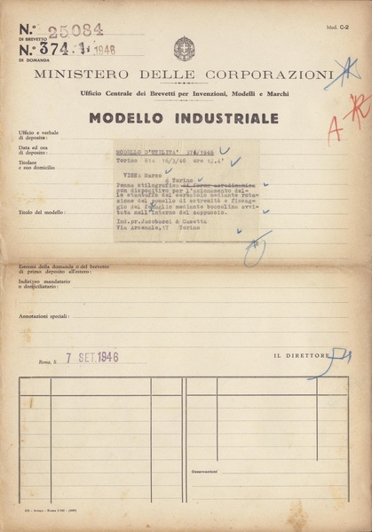 Privativa industriale per un modello di utilità. Testo descrittivo della registrazione: "Penna stilografica con dispositivo per l'azionamento dello stantuffo del serbatoio mediante rotazione del pomello di estremità e fissaggio del fermaglio mediante boccolina avvitata nell'interno del cappuccio".