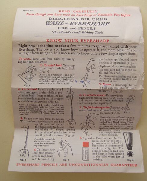 Scansione di un foglietto di istruzioni Eversharp degli anni '20. Relativo ad un modello Gold Seal Personal Point. Retro. Sull'altro lato di File:IstroPersonalPoint-front.jpg. Contributo di Roberto Vetrugno (utente forum.fountainpen.it roberto v)