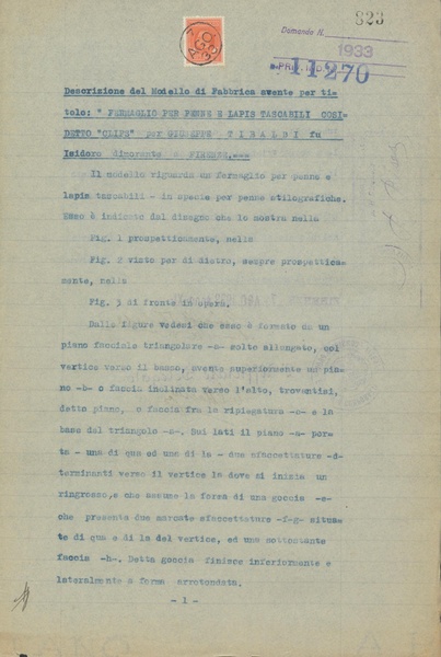 Privativa industriale per un modello di fabbrica della Tibaldi. Testo descrittivo della registrazione: "Fermaglio per penne e lapis tascabili così detto "Clips"".