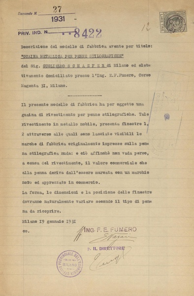 | attuale | 22:40, 2 set 2025 | 4 158 × 6 247, 5 pagine (2,74 MB) | Piccardi (discussione | contributi) | == Dettagli == {{InfoModello |Numero=8422 |Data=1931-12-12 |Richiesto=1931-01-19 |Marca=Kosca |Titolare=Guglielmo Schaefer |Tipo=di fabbrica |Titolo=Guaina metallica per penne stilografiche |Domanda=27 |Ufficio=Milano |Fonte=[https://tecadigitaleacs.cultura.gov.it/media/ricercadl?rictree=MINISTERO+DELL%27INDUSTRIA%2c+DEL+COMMERCIO+E+DELL%27ARTIGIANATO%2fUFFICIO+ITALIANO+BREVETTI+E+MARCHI%2fArchivio+generale%2fModelli%2fBrevetti+dal+n.+1+al+n.+100.000 Archivio Centrale dallo Stato] |Note=Attri... |